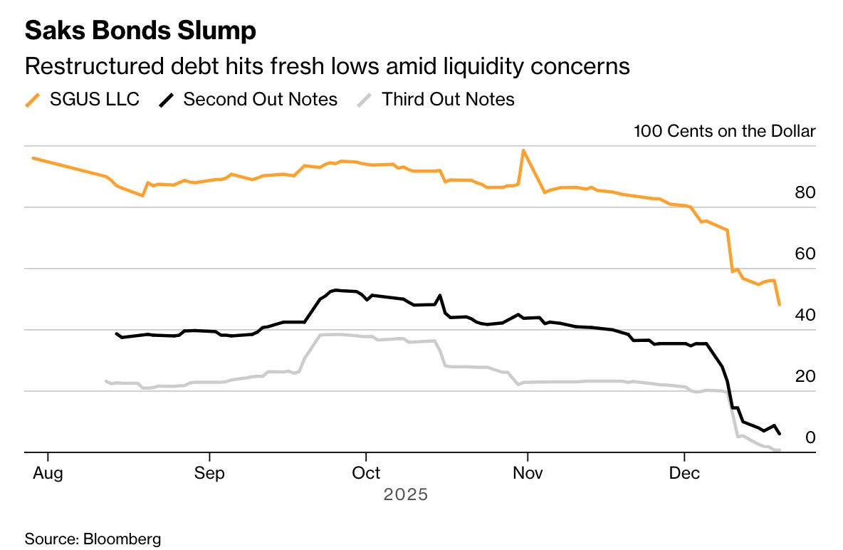 Saks faces interest payments of more than $100 million due Dec. 30, according to data compiled by Bloomberg. The $941 million portion of Saks’ second-out notes restructured in August were quoted at about 6 cents on the dollar on Tuesday, down from roughly 36 cents two weeks earlier, according to runs shared with Bloomberg. About $762 million of more senior debt was quoted at around 46 cents.