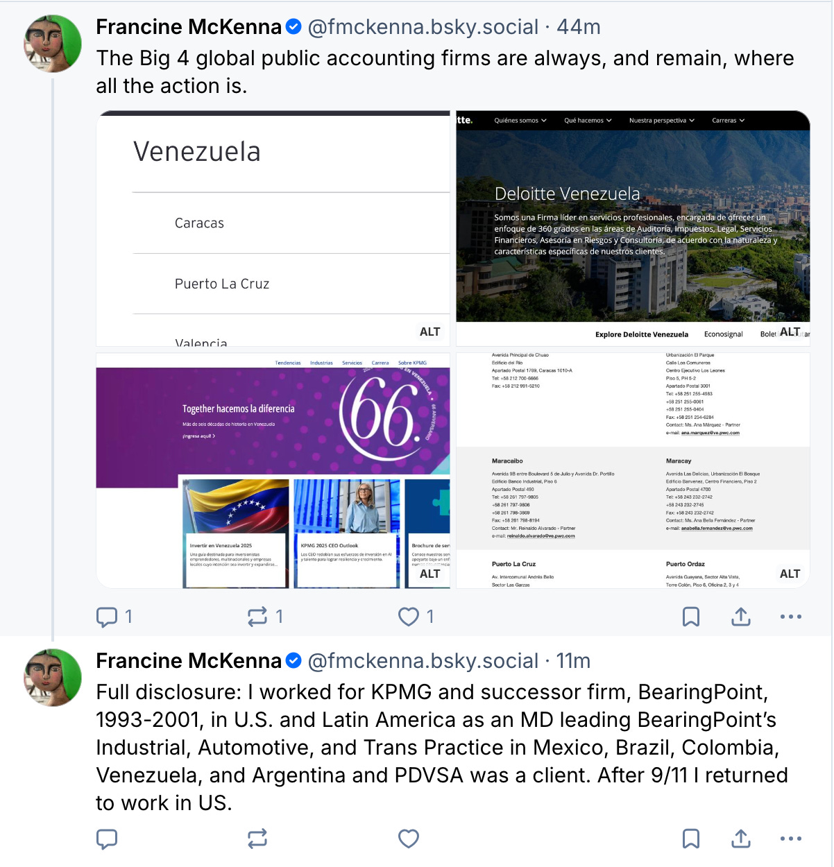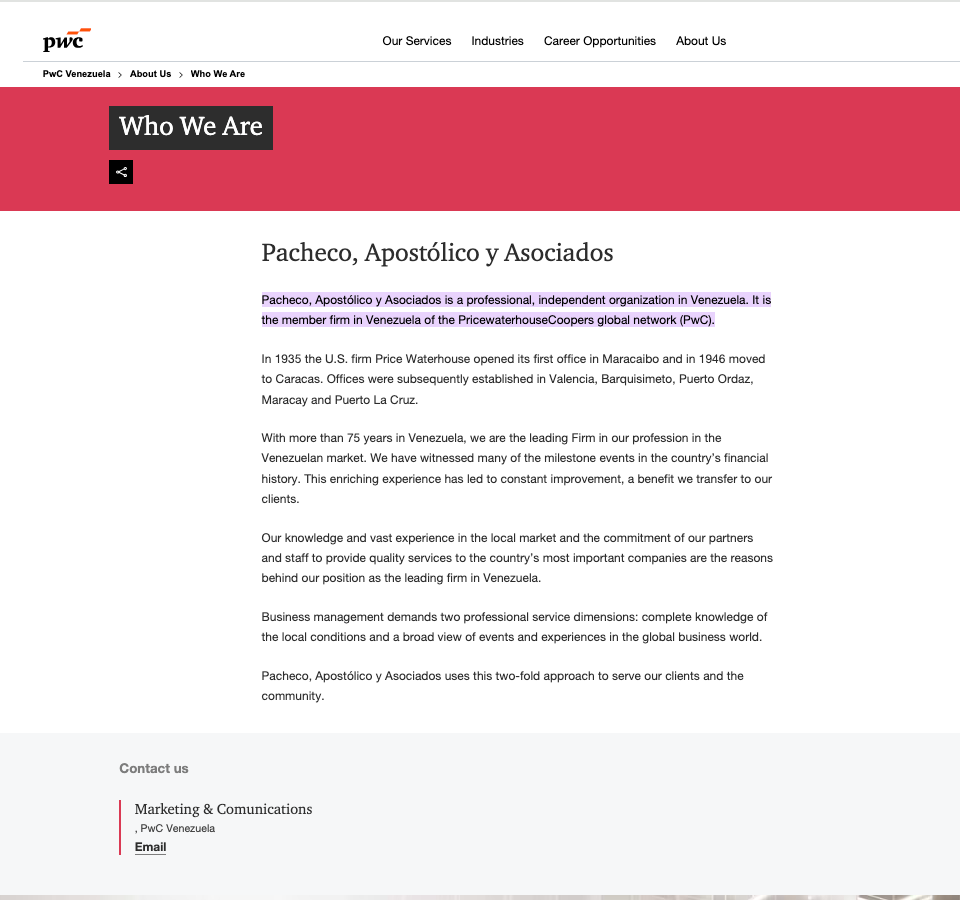 This info is at odds with what you find when you look up PwC Venezuela. You also find Pacheco, Apostólico y Asociados as seemingly the member firm in Venezuela.