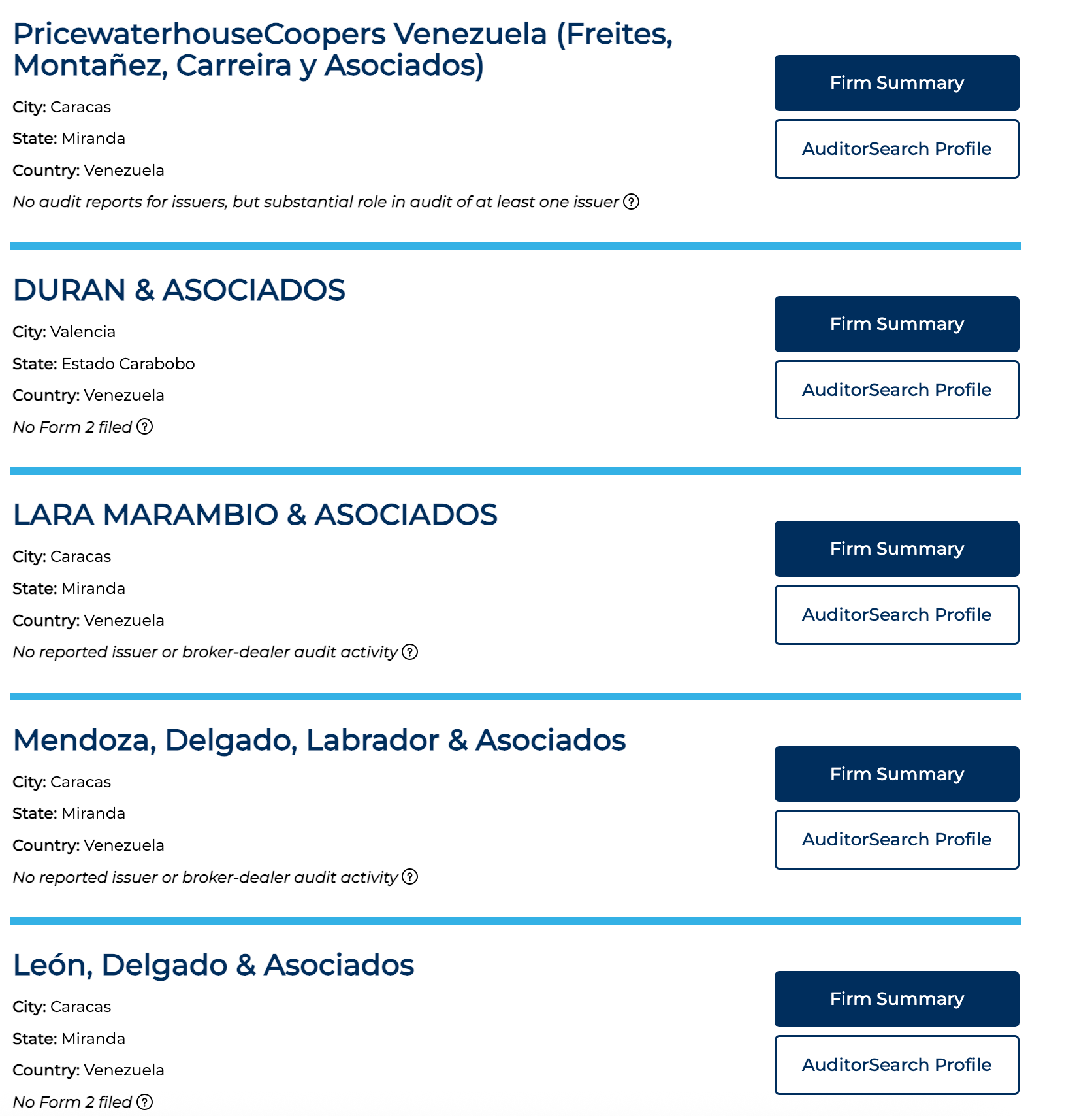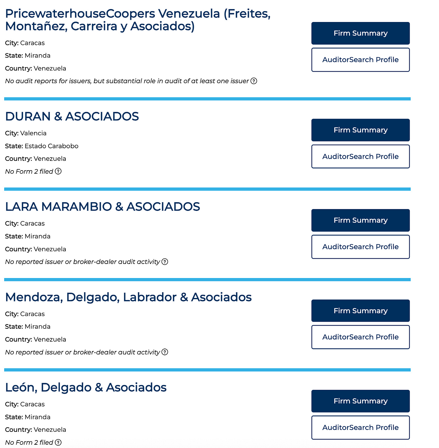 There are five Venezuelan audit firms registered with the PCAOB. Two of them are not even filing an annual report with the PCAOB.