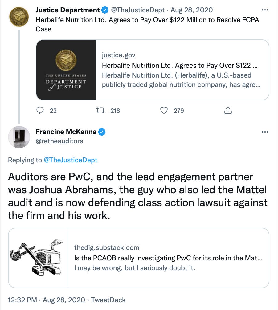 The SEC and PCAOB has never fined or sanctioned PwC, KPMG, Deloitte or Ernst & Young in any of these cases. KPMG did have to resign as auditor from two of Scott London’s clients, Herbalife and Skechers.